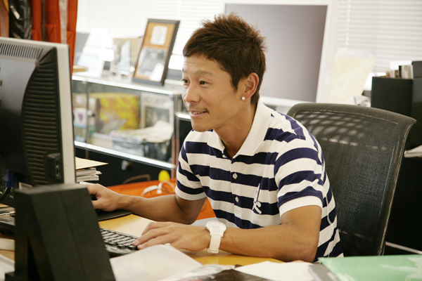 スタッフと同様に席を並べる代表の前澤さん。にこやかな笑顔を見せながら仕事中、と見せかけ息抜きでツイッター中