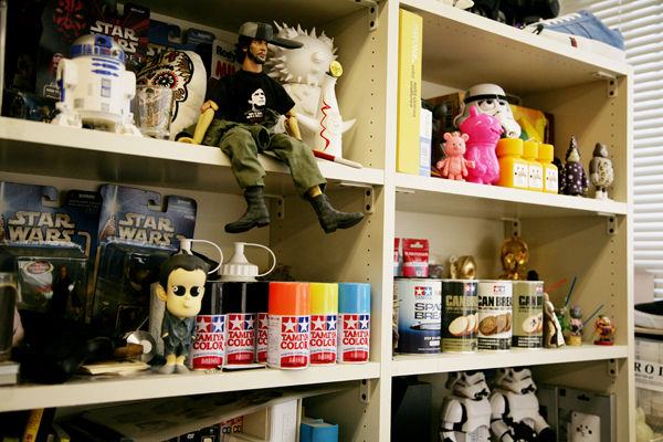 デザイン部を統括するJUN WATANABEさんのデスク周辺。ご自宅におじゃましたかのような楽しいアイテムに囲まれる。スニーカーは裏原宿のMAD FOOT!(http://www.madstore.jp/)とJUN WATANABEによる新ライン「MAD FOOT! By JUN WATANABE」のもの。サイトでも販売されている