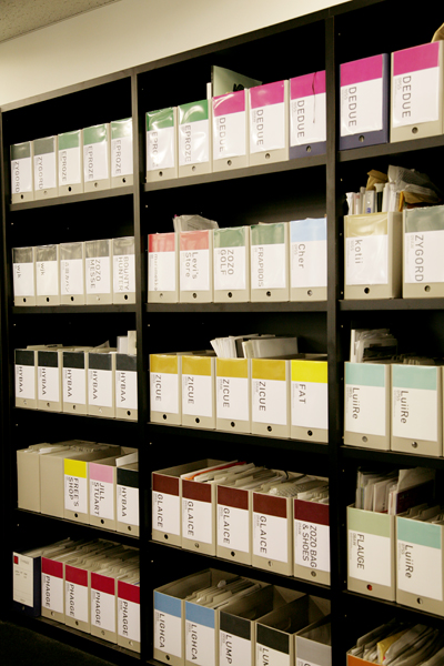 スタートトゥデイが運営するセレクトショップごとに、色分けされた箱に資料が並ぶ