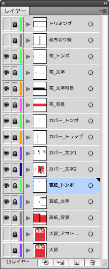 わたしの場合、ひとつのドキュメントで表紙、カバー、帯をまとめてデザインしています。この状態だと、重ねた状態をシミュレーションしやすいからです。 トンボは共用できないので、最終的にそれぞれについてつくります。デザインが完全に決定するまでは、裁断位置の枠だけつくっておいて、トンボはつくらないこともあります(なぜかというと、作業中に間違えて移動したりすることもあるから)。[効果]メニューのほうのトンボにしておくと、入稿直前に正確なサイズになっているか確認できるので、心配性なひとは安心です。アウトライン化を忘れないようにしないといけないですが。 デザインが確定するまでは、複数のデザイン案もレイヤーを分けて存在しているので、もっとぐちゃぐちゃです。左図はドキュメント分割直前くらいの状態なので、整理されていますが。 これはあくまでわたしがやってる方法で、デザイナーさんによっては、最初からドキュメントを分けて作業していることもあるかもしれないです。 トンボについては |