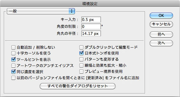 | Illustratorは滑らかに補完されたベジェ曲線のイメージが強いせいで、ピクセルの作業とは縁遠いように見られがちですが、設定を調整するだけで、一気にピクセルワールドになります。作業環境の設定といえばまずは[環境設定]ダイアログですが、[一般]のところでは、[キー入力]、[アートワークのアンチエイリアス]あたりが影響すると思います。 |