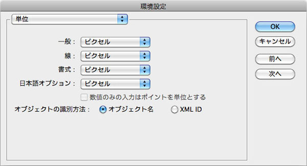 | [単位]も重要です。[一般]はドキュメント作成のときにも設定できるし、定規経由でも切り替えできるんですが、それ以外はここをいじらないと変更できません。直前に印刷系の作業で[ミリメートル]とか[歯]とか使ってたりすると、調整する必要に迫られることもあるかも。 | 単位については |