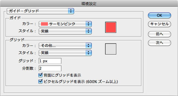 | [ピクセルグリッドを表示]をオンにしておけば、高倍率のピクセルレベルの作業になったとき、どのみちピクセルグリッドが表示されるので、とくに設定しなくても困らないかもしれないです。グリッドを設定する場合は、1ピクセルを2で割るようにしておくと、ピクセルの中央にアンカーポイントが打てて便利です。 | グリッドについては |