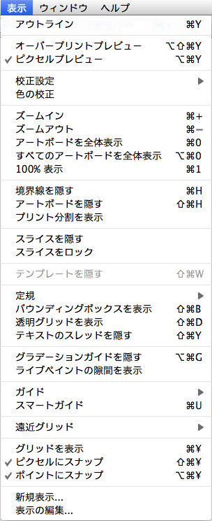 ピクセルの見え方は[表示]メニューと関連があります。影響するのは[ピクセルプレビュー]、[ピクセルにスナップ]あたりです。実際にどうなるのかは、このあと解説します。 グリッドをピクセルと関係ない単位(ミリなど)で設定したり、端数が出るような設定([グリッド:2.53px]で[分割数:2]とか)に設定することも可能ですが、ピクセルプレビューモードで作成したオブジェクトと通常モードで作成したオブジェクトで、[グリッドにスナップ]が効いたり効かなかったりといった差が出るなどの変な現象が出るので、いまからピクセルで作業する、と決めたら、妙なことはしないほうがよさそうです。 ピクセルプレビューについては |