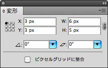 ![]() 作業環境をピクセルに最適化してしまえば、オブジェクトの位置やサイズのコントロールは簡単です。 デフォルトではアートボードの左上角が原点になり、変形パネルにはそれを基準にしたオブジェクトの座標が表示されます。ただし、バージョンによっては(とくに古いバージョン)、アートボードの左下角がデフォルトの原点だったりするので、変更が必要でしょう。 左図は、通常モード(ピクセルプレビューモードではない)で表示した状態です。 表示:通常 アンチエイリアス:オン 線の位置:中央 変形パネルについては |