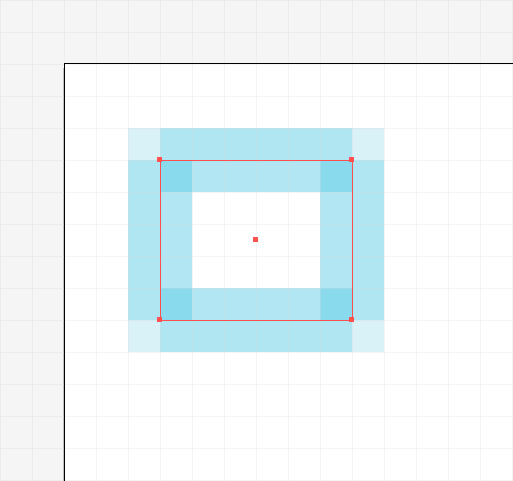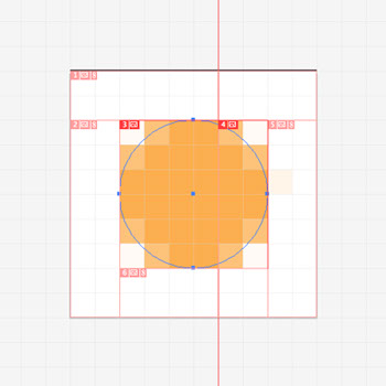 これはピクセルプレビューモードに変更した状態です。表示倍率が600%を越えているので、うすいグレーの線でピクセルグリッドが表示されます。 [線幅:1px]だと、線がちょうどピクセルグリッド上にのる状態になり、アンチエイリアスがかかることで線がぼやけます。 表示:ピクセルプレビュー アンチエイリアス:オン 線の位置:中央 |