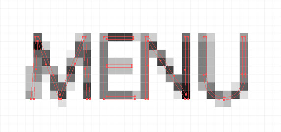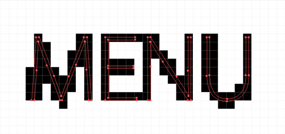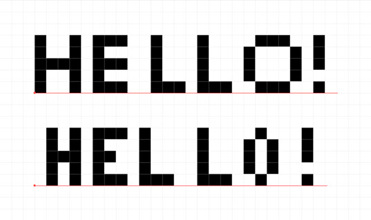 文字の場合、もうひとつ気をつけないといけないことがあって、文字をアウトライン化すると、ピクセルフォント風にはならない、ということです。 左図の状態をパスに変換する場合は、いったんラスタライズして、モザイクオブジェクトに変換するのが一番簡単なんじゃないかと思います。 ラスター書き出しについては ラスタライズについては モザイクオブジェクトについては |