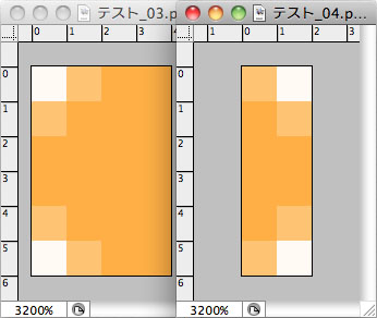 環境設定でアンチエイリアスをオフにすると、線はクリアになりますが、表示のシステム上どちらかのピクセルにはめこまないといけなくなるので、この場合こんな感じに位置がずれます。 表示:ピクセルプレビュー アンチエイリアス:オフ 線の位置:中央 |