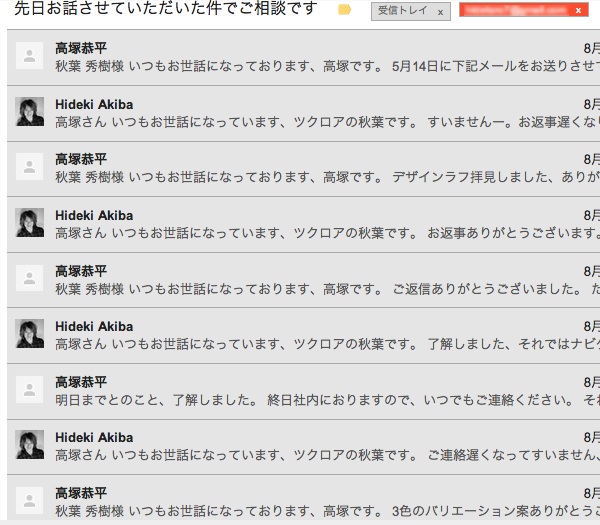 仕事メールのやり取りほど、急ぎで内容を追いたい時がある。これは、筆者とクライアントとの間でやりとりしたメールの履歴をたどっていったときに、ハッと気づいたことだ。日本人の慣習というべきだろうか、見てわかるとおり「○○様 いつもお世話になっております。○○です…」とつけてしまい、おもしろいほど同じような決まりのあいさつが一覧される(なお、メール画像についてはクライアントより掲載許可をいただいている)。