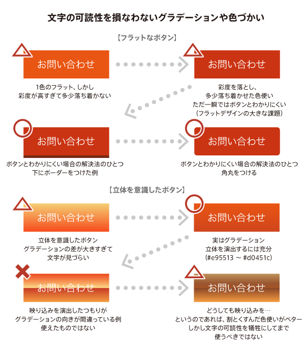 ただ、フラットでよい傾向だと思われるのは、ボタンの文字の可読性が良くなることだ。グラデーション上に文字が乗るのは、それだけで可読性を損ねてしまうリスクがある。では1色塗りならいいのか? というと一概には言い切れない。下図を参考にしてほしい。1色だろうがグラデーションだろうが、どちらにしてもバッドケースは存在する。