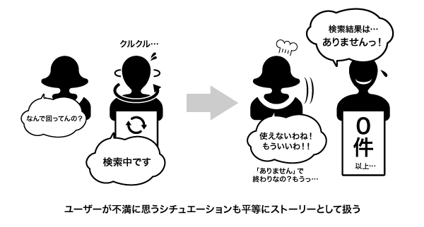 そこでは「検索結果がありません…」とアプリ役に伝えられて落ち込むユーザーの姿が見られたり、逆に回答件数が多すぎてどれにしようか悩むユーザーを寸劇で演出したため、「モバイル上では検索結果を多数表示することが必ずしもよいわけではない」ということが共通の認識として得られた。都合の悪い状況も含めてUXを考えるべきなので、では画面はどうデザインされるべきか? を考える必要が見えてきた。