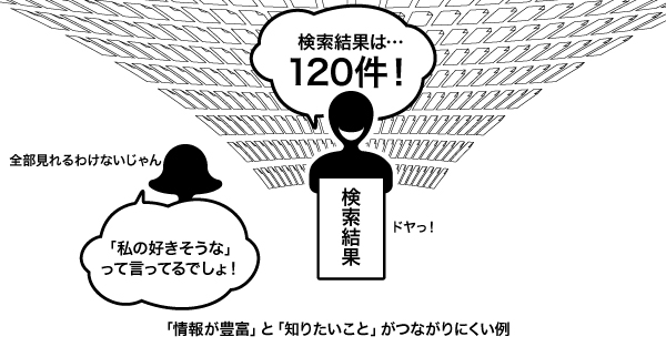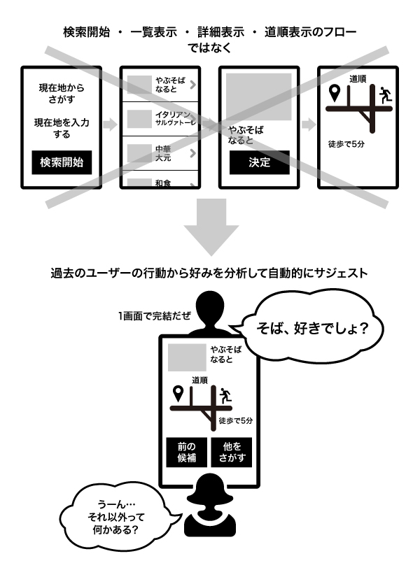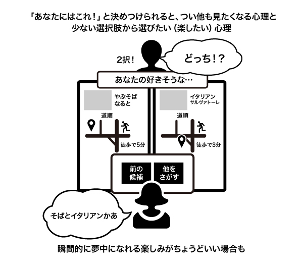 このアドバイスには、おおいに共感した。なにもかも自動化するアプリより、ユーザーに2択くらいの選択をさせる検索結果のほうが単純に面白みがあるし、選択の作業に疲れもない。わがままなユーザーの欲求バランスを、うまい手法で満たしていると考えられる。