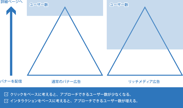 一般に、バナー以降のページに遷移するユーザー数よりも、バナー内でインタラクションを行うユーザー数のほうが多い。こうした特徴から、後日、別の広告を表示する見込み顧客の母数を増やすことが可能になる。