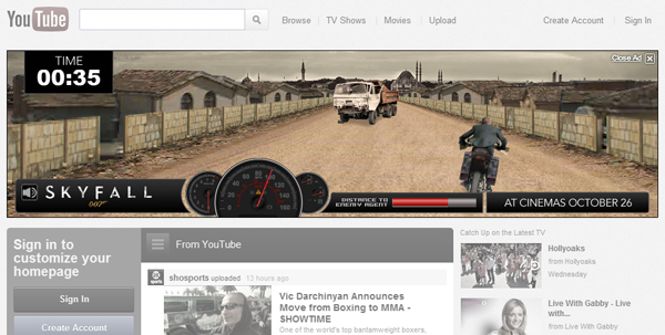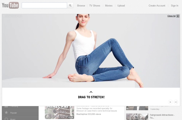 YouTube上で展開されるリッチメディア広告。バナーをクリックすると領域が拡大。「DRAG TO STRETCH!」と書かれている映像をマウスで触れることにより、映像自体を引き延ばしたり縮めたりできる。感覚的に商品イメージを訴求している。