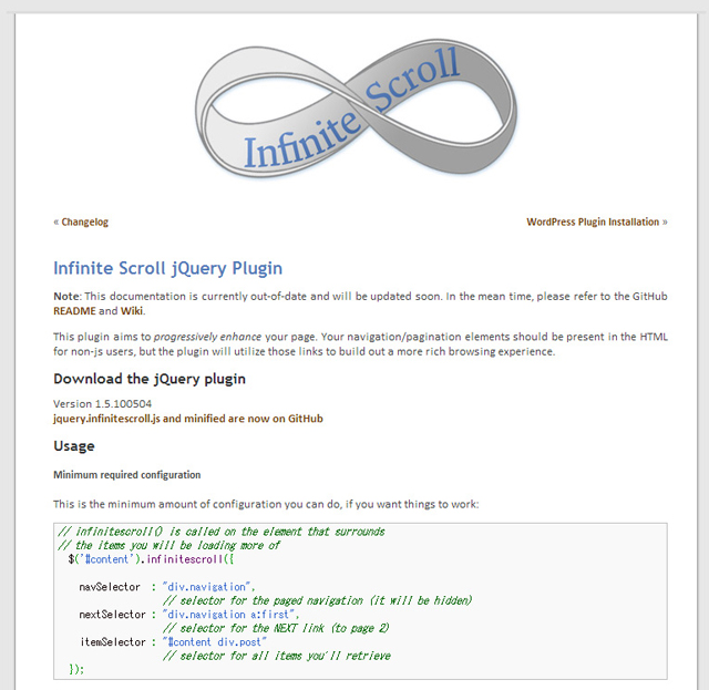 無限スクロールの実装に使用する「Infinite Scroll」プラグインは多くのサイトで導入され、またブログ構築で人気のあるWebアプリケーションWord Pressでも専用プラグインがあるなど、信頼性が高く、実績のあるjQueryプラグインだ。
