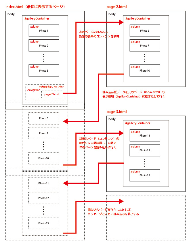 <div id="galleryContainer" class="inner"> <div class="column"> <p class="photo shadow"> <img class="deferred" src="img/loader.gif" data-original="img/21.jpg" alt=""> <noscript><img src="img/21.jpg" alt=""></noscript> </p> </div> ・・・省略・・・ <div class="column"> <p class="photo shadow"> <img class="deferred" src="img/loader.gif" data-original="img/25.jpg" alt=""> <noscript><img src="img/25.jpg" alt=""></noscript> </p> </div> <div class="navigation"> <p><a href="page-2.html">Next</a></p> </div> </div>