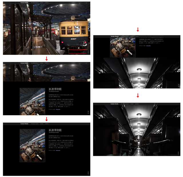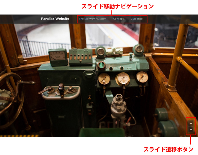 <section class="parallax" id="slide2"> <div class="slideContent"> <div class="descriptionContainer"> <header> <h2>鉄道博物館</h2> <p class="meta">The Railway Museum</p> </header> ・・・省略・・・ </div> </section>