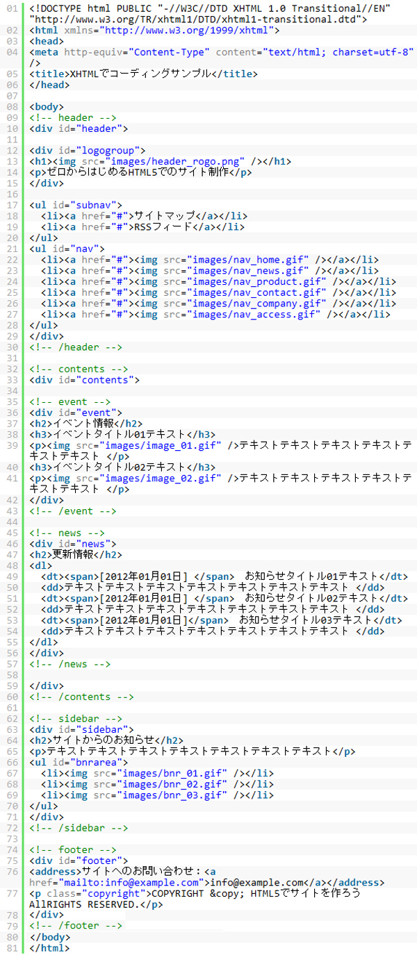 ※CSSレイアウト用のclassやidなどは一部つけていない状態です