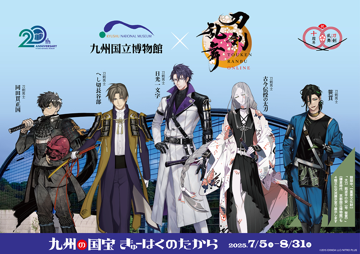 名刀の展示を記念して、人気コンテンツ「刀剣乱舞ONLINE」とのコラボも展開されることになりました。「日光一文字」「へし切長谷部」「古今伝授の太刀」「同田貫正国」「笹貫」の5振りの刀剣男士の等身大パネルと描き下ろしイラストが展示されます。