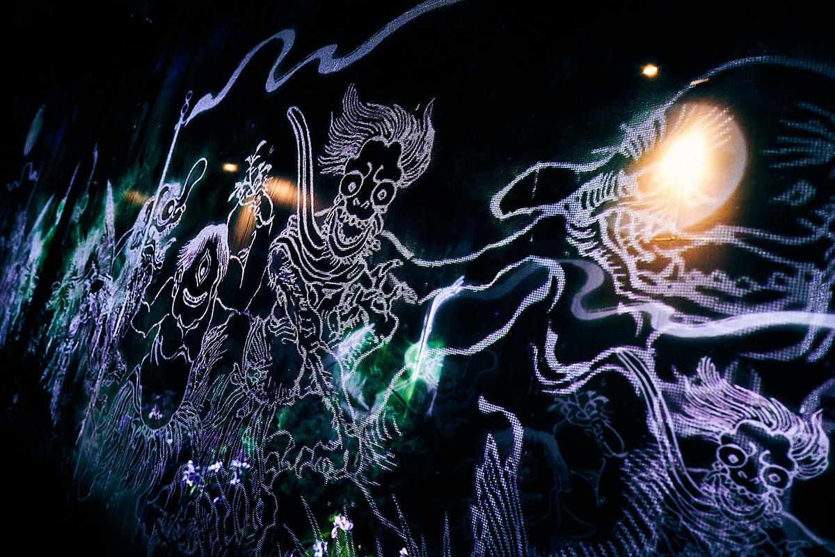 本展は、3DCGやプロジェクションマッピングやホログラフィックスクリーンなどのデジタル技術を駆使し、妖怪たちがダイナミックに躍動していることが魅力です。立体造形も相まってリアルな妖怪の世界が再現されています。ただ鑑賞するだけでなく、妖怪たちと一緒に動画や写真撮影を楽しんだり、立体的な映像空間を体感できたりと、妖怪の世界に徹底的に没入できる仕組みです。