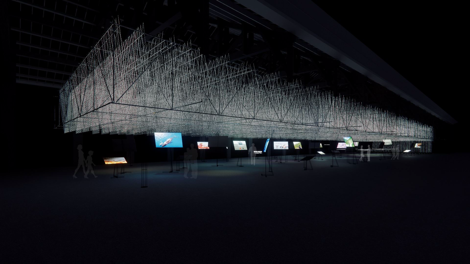 「水」を起点とした展示では、映像、音、香り、空間演出が融合