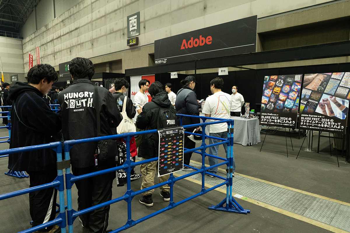 この「BLARE FEST. 2026」にアドビが協賛し、Adobe FireflyとAdobe Expressを活用したデザイン体験ブースを初出展しました。ブースには2日間で約500人が来場し、音楽フェスの新しい楽しみ方を提案する試みとして、ファンからも好意的な声が多く寄せられています。そこで今回はアドビが出展したデザイン体験ブースの様子をレポートします。