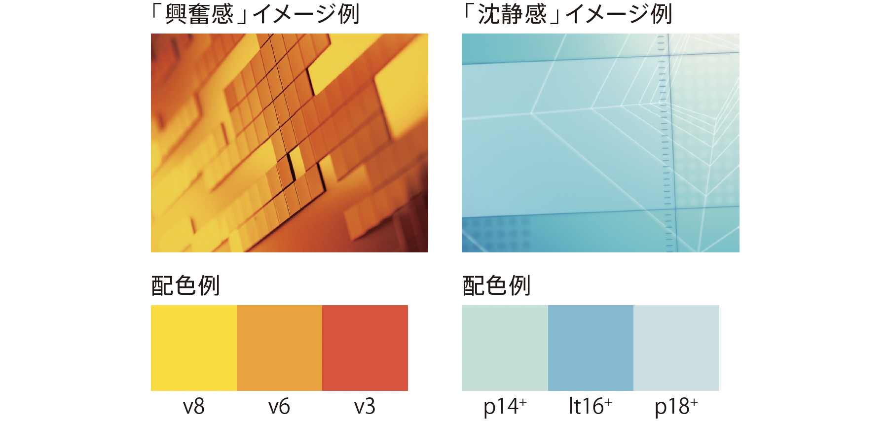 暖色系の高彩度色(ビビッドトーン)の組み合わせが「興奮感」が強いイメージに、 寒色系の低〜中彩度色の組み合わせが「沈静感」を与えるイメージになります。