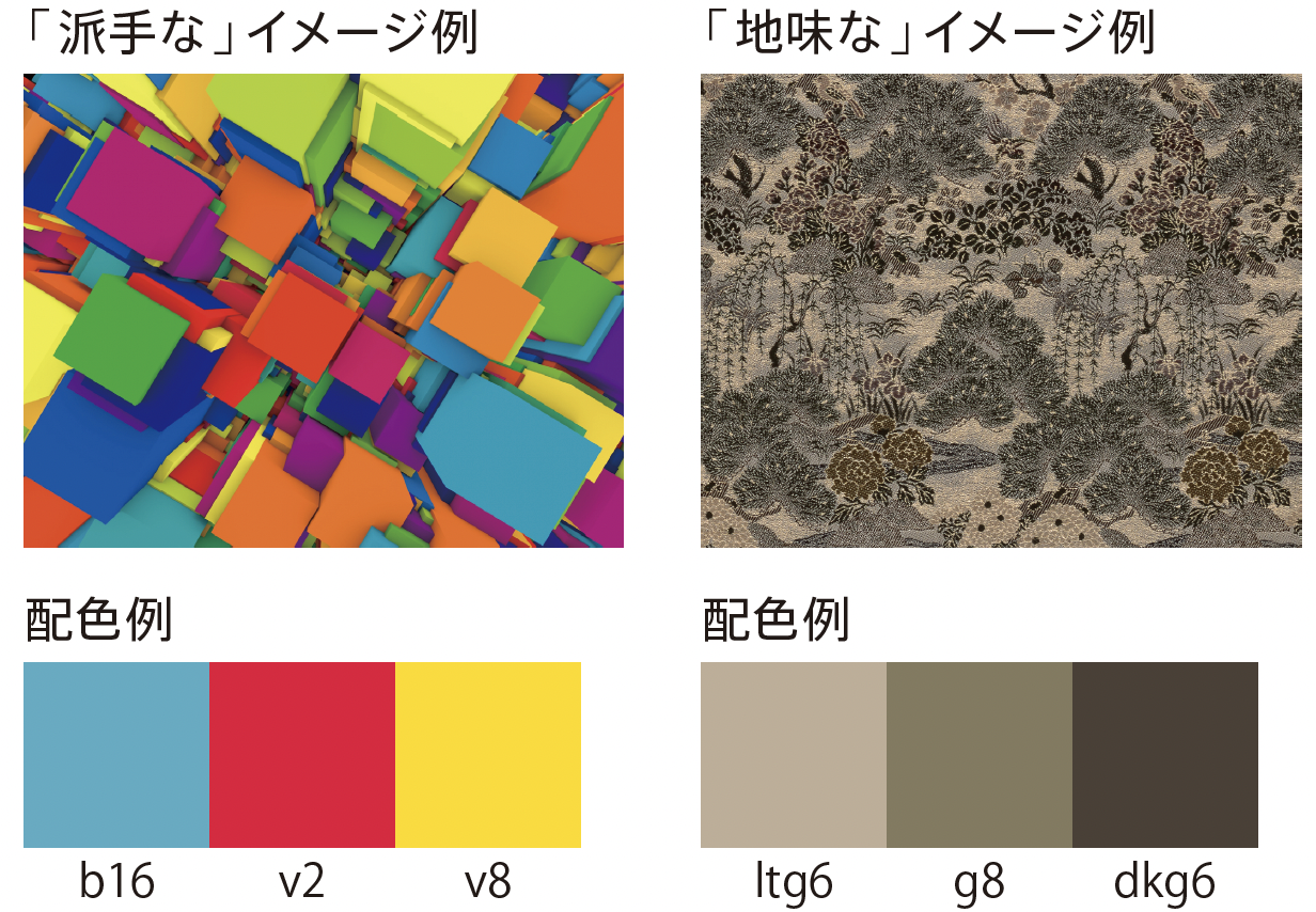 高彩度色の組み合わせが「派 手な」イメージに、低彩度色 の組み合わせが「地味な」イ メージになります。 色相差を大きくすると「派手 な」印象がより強調されます。