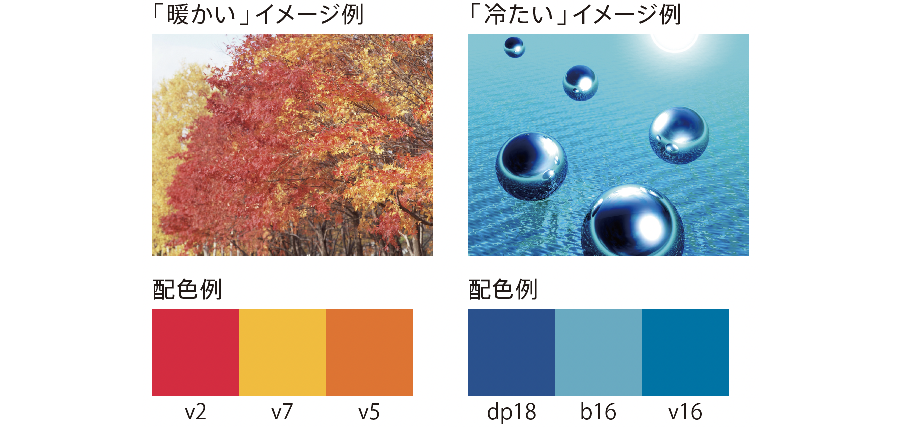暖色の組み合わせが「暖かい」イメージに、寒色の組み合わせが「冷たい」イメー ジになります。