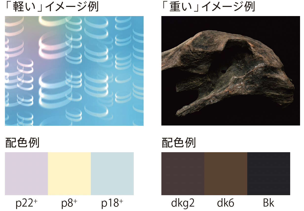 高明度色の組み合わせが「軽 い」イメージに、低明度色の 組み合わせが「重い」イメー ジになります。