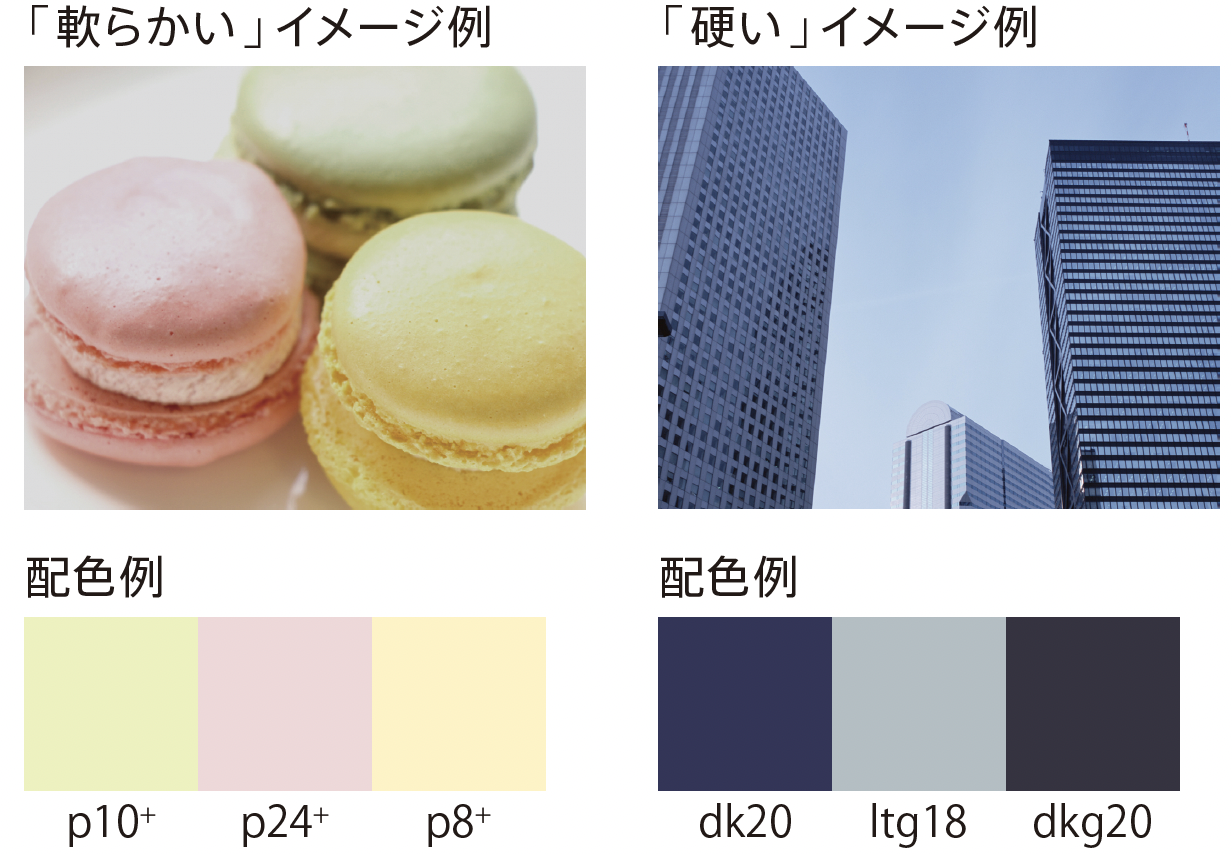 高明度色の組み合わせが「軟 らかい」イメージに、低明度 色の組み合わせが「硬い」イ メージになります。 曲線や有機的な形を使うと 「軟らかい」印象に、シャー プで直線的な形を使うと「硬 い」印象になります。