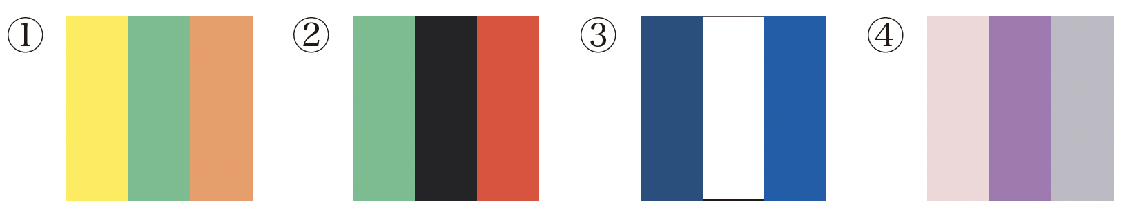 ① 高彩度色の組み合わせは、「重い」イメージになる。