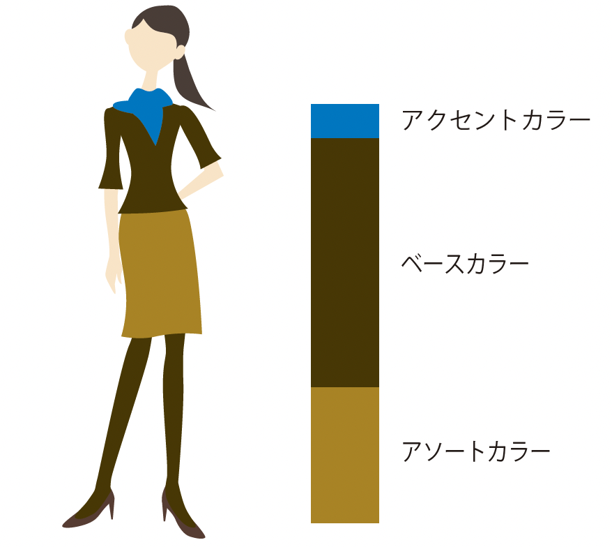ファッションでは、美しく見せるために色の組み合わせを調整するカラーコーディネートが必要です。カラーコーディネートはベースカラー、アソートカラー、アクセン トカラーが基本となります。