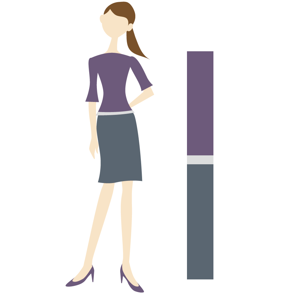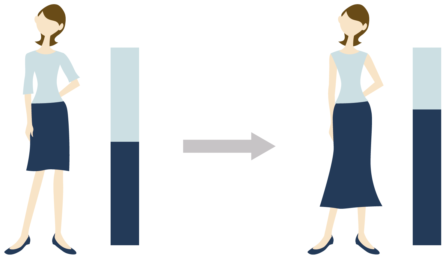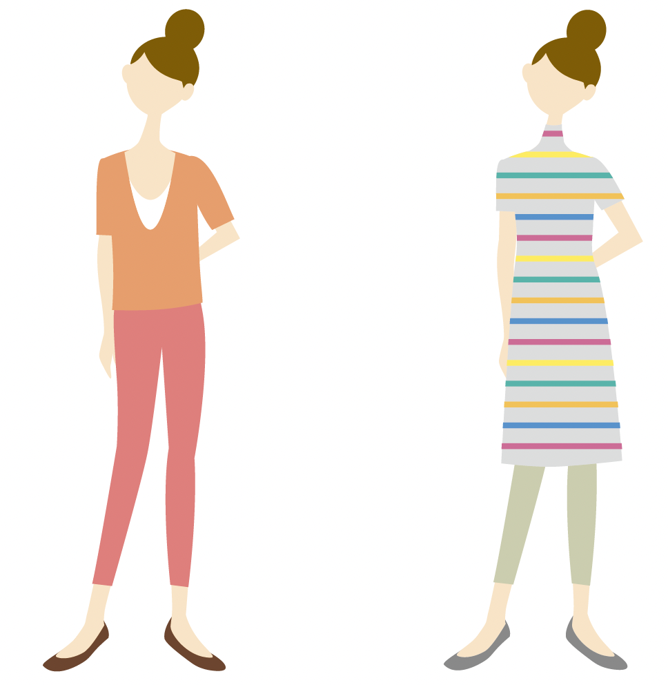 ファッションでは、トップ( 上半身)とボトム( 下半身)の面積比、トーンや色相の配色バランスも重要です。