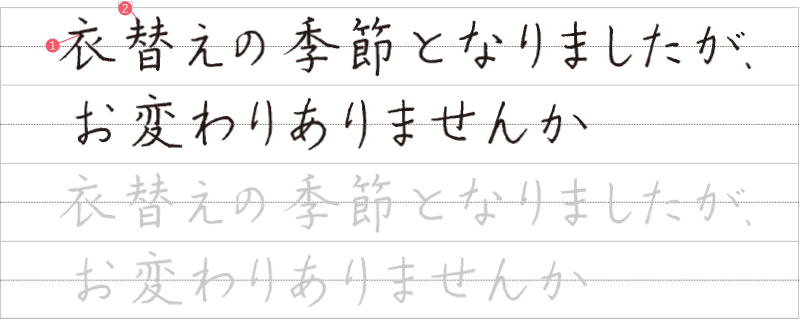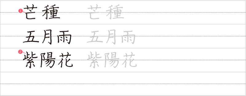 ❷ 4画目の横画は気持ち短めに、5画目はやや長めに払いましょう。