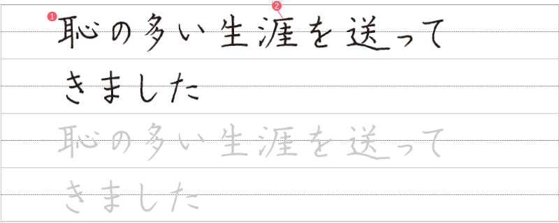 太宰治の小説『人間失格』第一の手記より、書き出しの一文を取り上げました。文学作品をていねいに書写することで忍耐力も鍛えられます。❶「耳」は細長く、「心」は小さく書き、上下にスペースを残します。