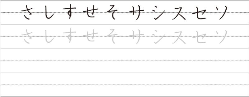 「さ行」と「サ行」を練習します。ひらがなは丸みのある柔らかい線で、カタカナは「止め・はね・払い」をしっかりと書きましょう。さ行の字母:左→さ 之→し 寸→す 世→せ 曽→そ
