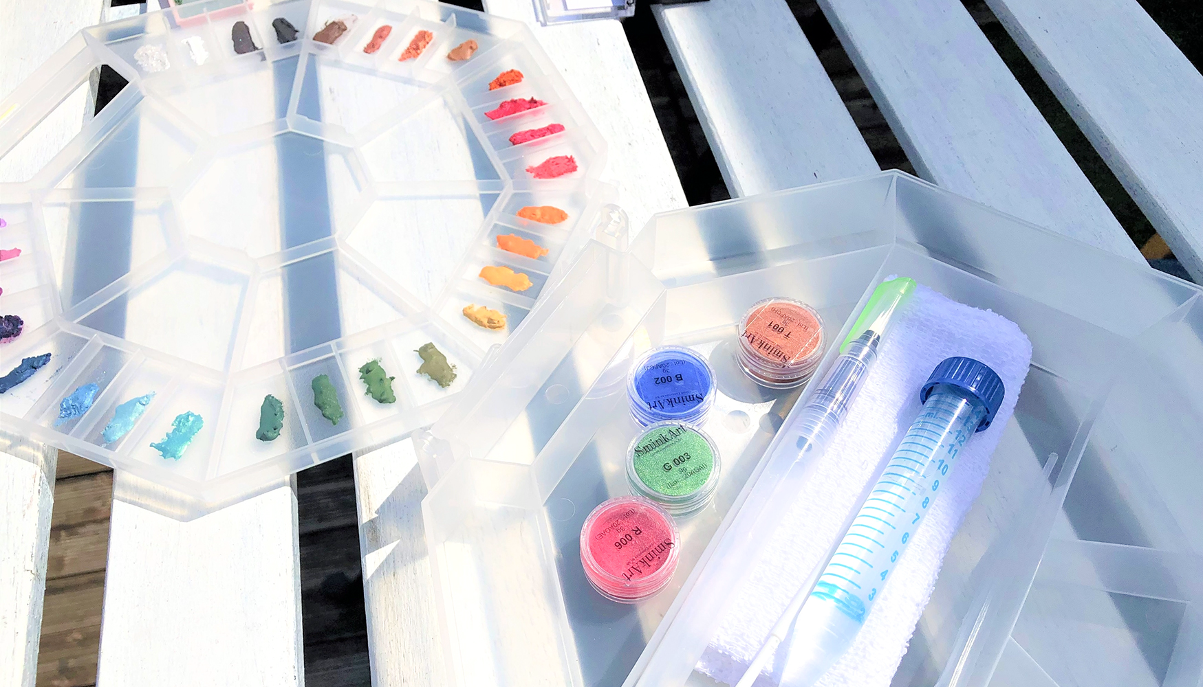 また、弊社が協業している化粧品メーカー16社から購入している、廃棄予定だった化粧品の中身を「magic water」で特殊処理した水溶性の粉末状色材「SminkArt ときめくペイント」も販売しています。こちらはすでに水になじむ処理をしてあるので、水と混ぜるだけで絵具として使用できます。粉末のまま用いれば、レジンやワックスなどの雑貨の色材にもなります。