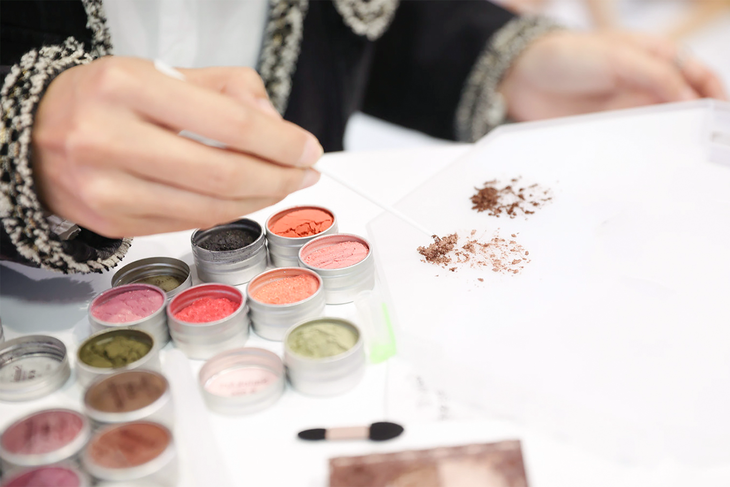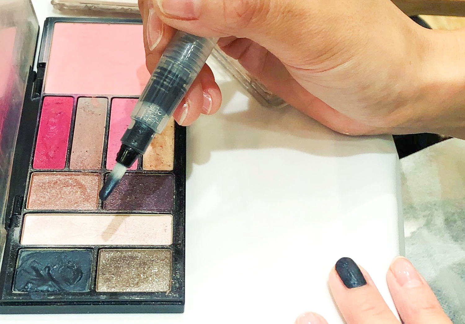 田中:まず、アイシャドウやチークなどの粉末状化粧品をできるだけ細かく砕き、「magic water」と混ぜて一般的な水彩絵具のようなペースト状にします。一度ペースト状にしてしまえば、その後は水で溶けます。お好みの色濃度に調整することもでき、多めの水で溶いて淡く水彩絵具のように使うことも、粘度を高くして油絵具のように盛り上げて使うことも可能です。また、簡単に絵具化を楽しむ方法として、水筆ペン(中央部を指圧すると内部の液体が筆先から吐出するタイプの筆ペン)の中に「magic water」を入れ、筆先に吐出した「magic water」をアイシャドウパレットなどの化粧品に直接触れさせて溶かしながら絵具にするという使い方もあります。