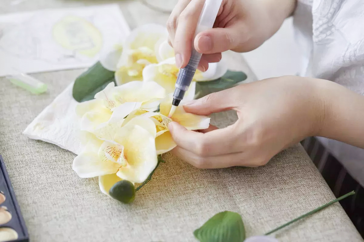 ほかには、「magic water」に香水やアロマオイルを混ぜこむことも可能なため、香り付きの化粧品由来の絵具をつくることができるのも特徴です。ものによって差はありますが、香水の場合は2〜3週間、アロマオイルの場合は3〜4カ月ほど香りが持続します。弊社が実施しているワークショップでは、店頭の加飾で使った白い造花などを、使わなくなった香水やアロマオイルで匂いをつけた化粧品由来の絵具で塗り、フレグランス雑貨をつくる体験も提供しています。