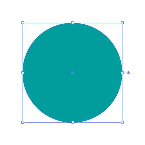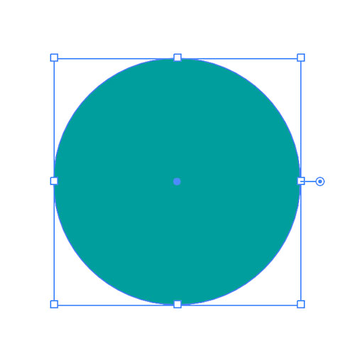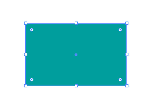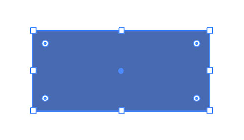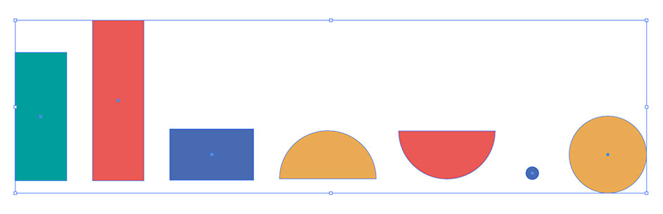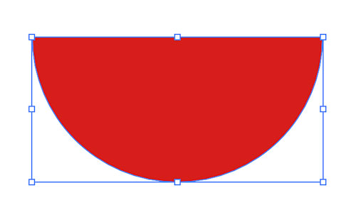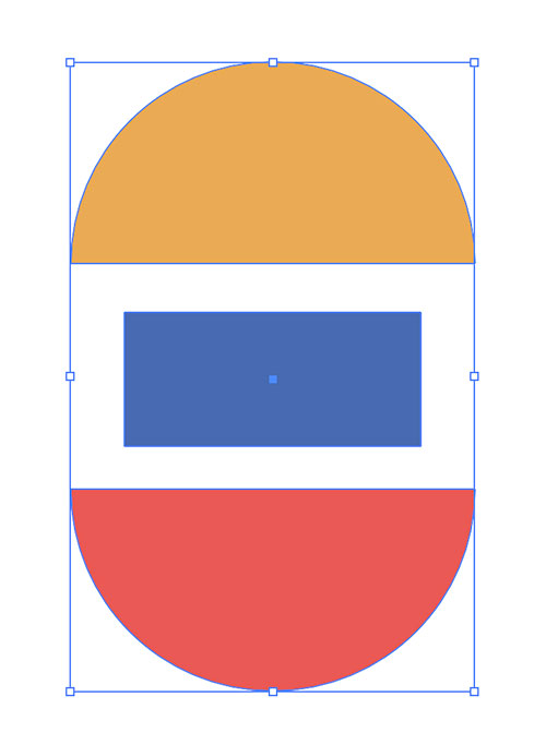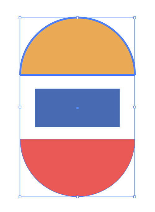 さらに文字を作っていく。まず、最初の工程で作成した青の横長の長方形をコピー&ペーストしたら、変形パネルの[長方形のプロパティ]の[縦横比を固定]をオフにし、[W:110px]、[H:50px]に設定して適用する(図31)(図32)。続いて半円の図形をコピー&ペーストして長方形を間に挟むようにざっくり配置したあと、これら3つの図形をすべて選択(図33)。その状態のまま、選択ツールで上の半円をクリックして選択する(図34)。これによって上の半円がキーオブジェクトに設定される。