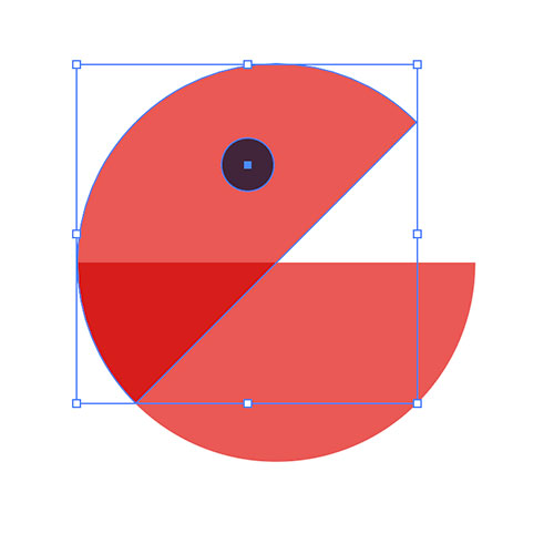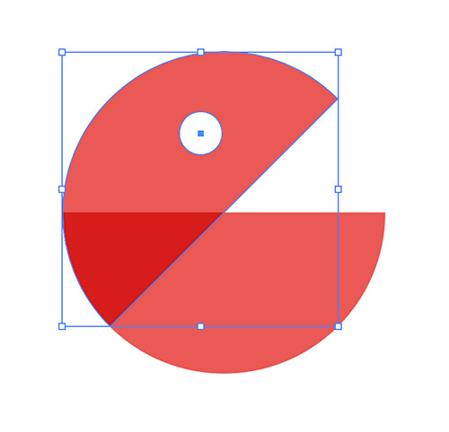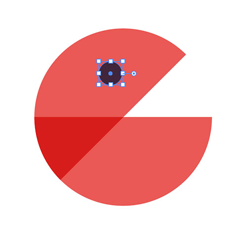 続いて、回転した赤い半円の前面に小さな青の円を移動して重ねたあと(図23)、選択ツールで回転した赤い半円と青い小さな円の両方を選択し(図24)、オブジェクトメニュー→“複合パス”→“作成”を実行する(図25)。これで「e」の字が表現できる。