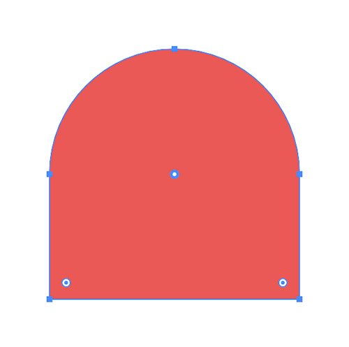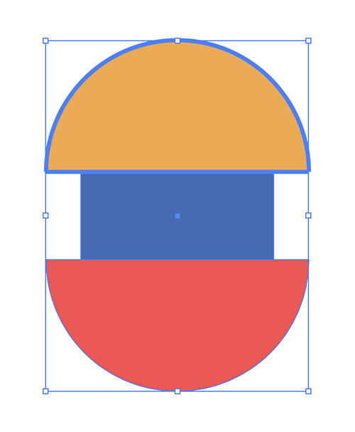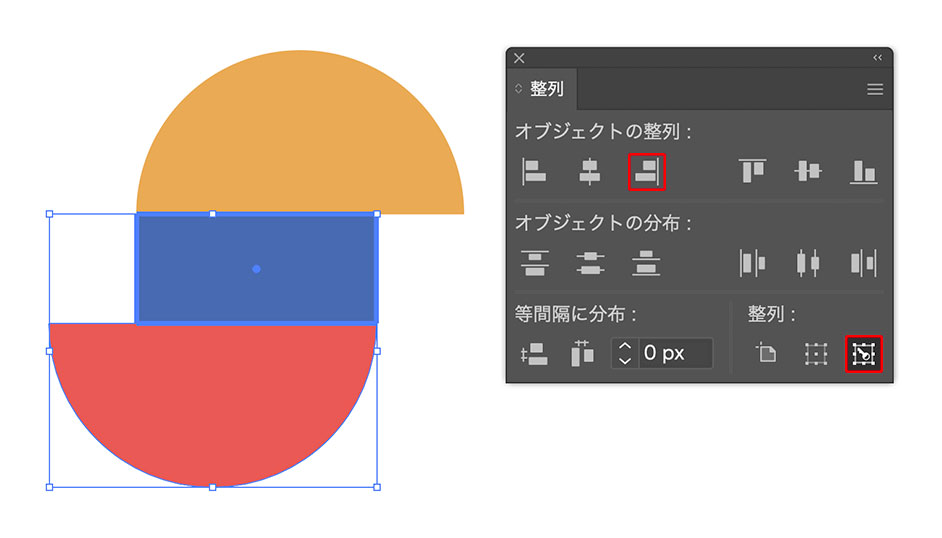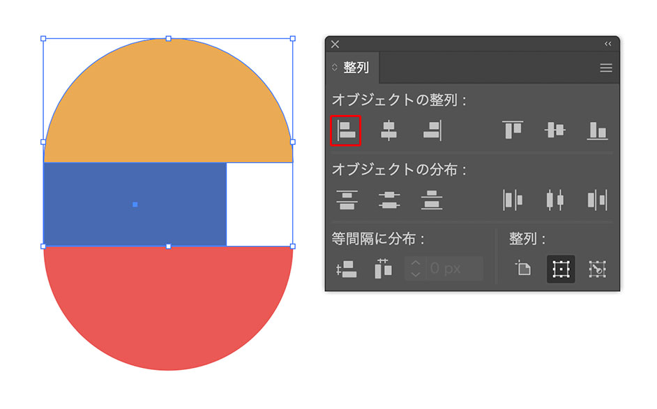 次に、上の半円と長方形を選択して整列パネルの[オブジェクトの整列:水平方向左に整列]をクリックして適用(図37)。さらに、長方形と下の半円を選択したあと、選択ツールで長方形をもう一度選択してキーオブジェクトにし、整列パネルの[整列:キーオブジェクトに整列]をオンにした状態で、[オブジェクトの整列:水平方向右に整列]をクリックして適用する(図38)。