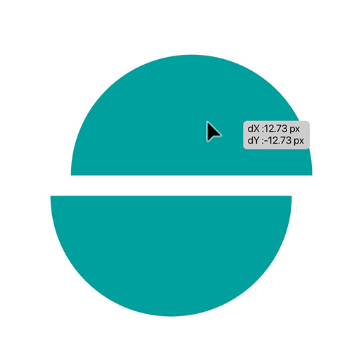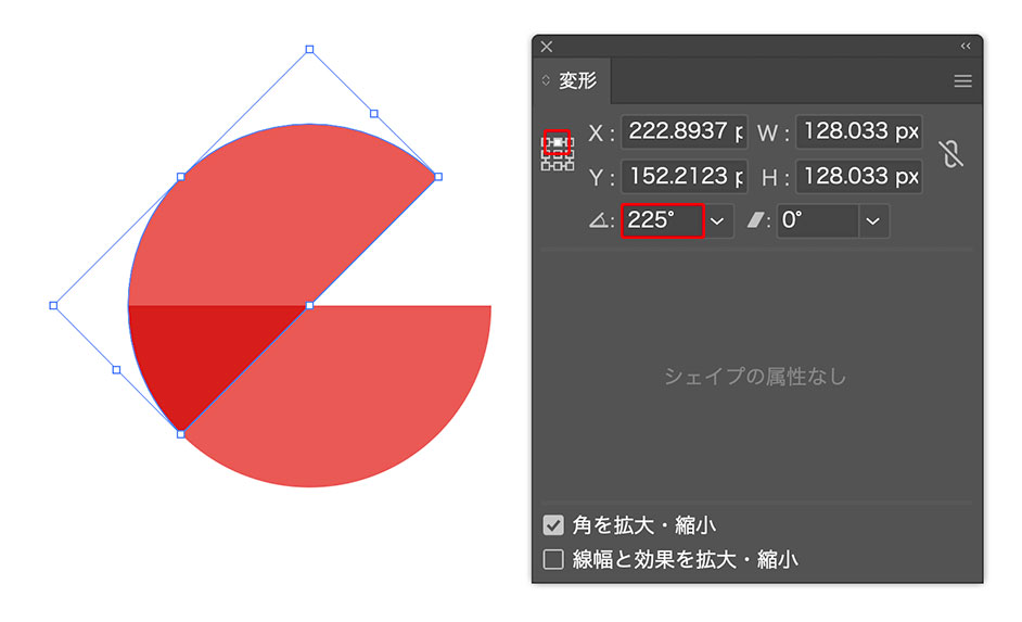 次に、選択ツールで赤い半円を選択してコピーしたら、command+Fキー(Macの場合。WindowsではCtrl+Fキー)を押して前面へペーストする(図21)。続いて変形パネルの基準点のうち上辺の中央をクリックして選択したあと、[回転:225°]に設定して適用(図22)。