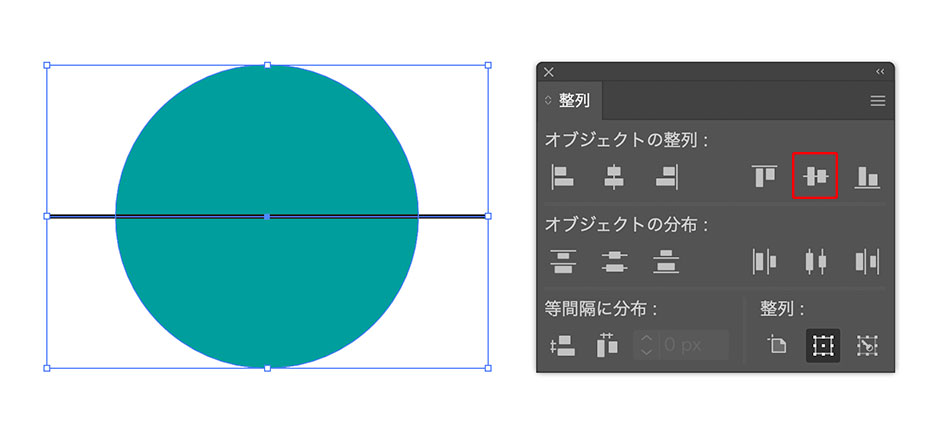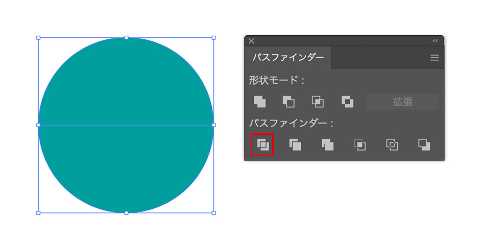 選択ツールで円と直線を両方とも選択したら、整列パネルの[オブジェクトの整列:垂直方向中央に整列]をクリック(図7)。その状態のまま、パスファインダーパネルの[パスファインダー:分割]をクリックし(図8)、オブジェクトメニュー→“グループ解除”を実行する。これによって円が直線の上下で分割され、それぞれ別のオブジェクトとして扱えるようになる(図9)。