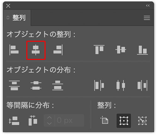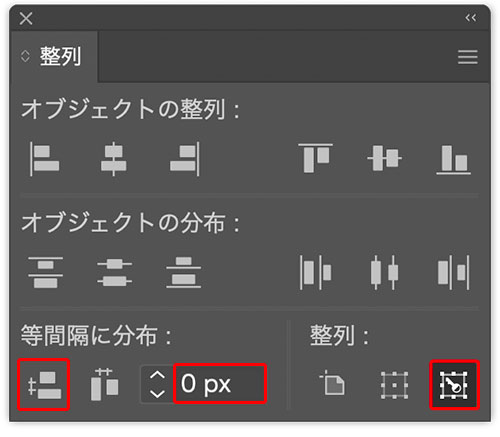 続いて整列パネルの[整列:キーオブジェクトに整列]を選択したあと、[等間隔に分布:垂直方向等間隔に分布]を[間隔値:0px]に設定して適用する(図35)(図36)。