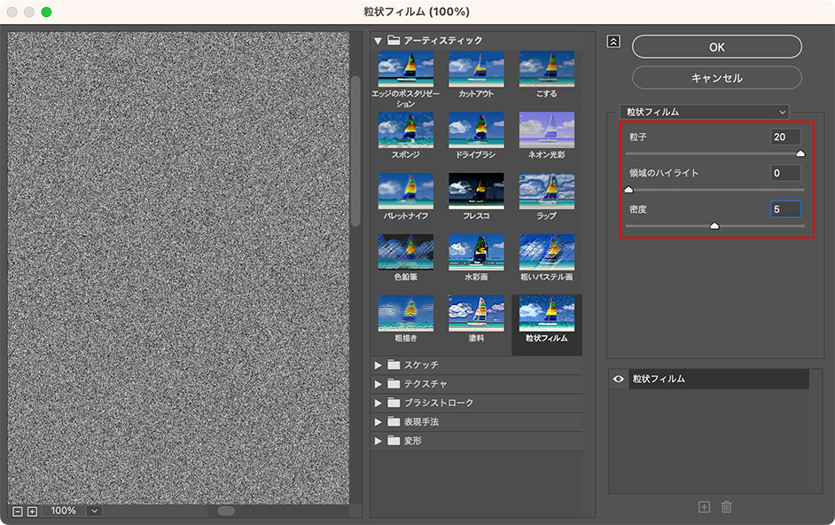 再び長方形ツールでアートボードサイズの長方形を描き、[塗り]を16進数カラーコード[#999999]のグレーに、[線]を[なし]に設定(図60)。この長方形が選択された状態で、効果メニュー→“アーティスティック”→“粒状フィルム...”を選び、[粒子:20]、[領域のハイライト:0]、[密度:5]で適用する(図61)(図62)。