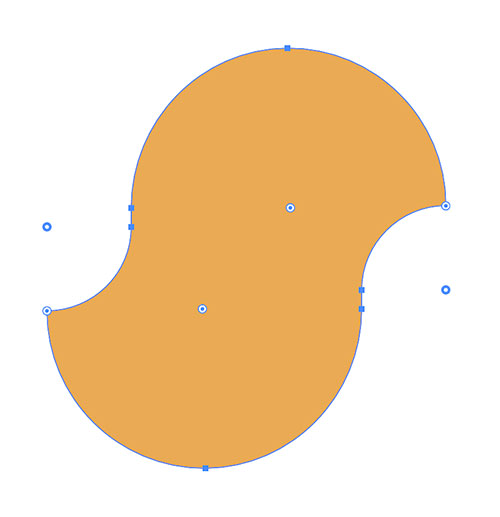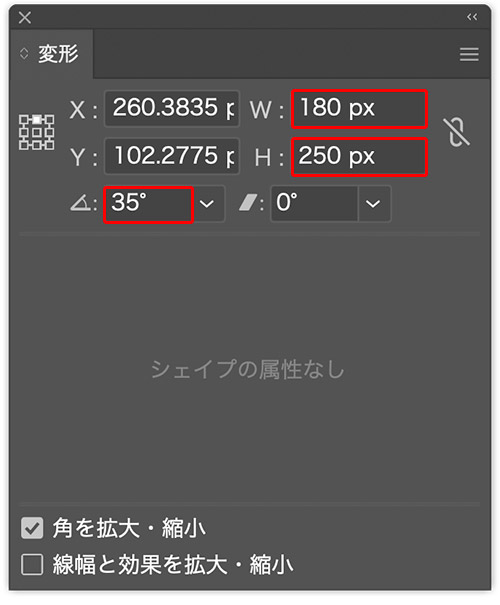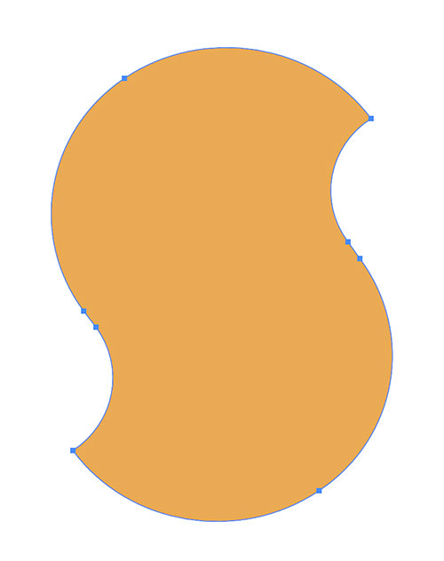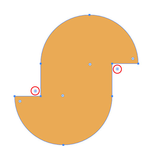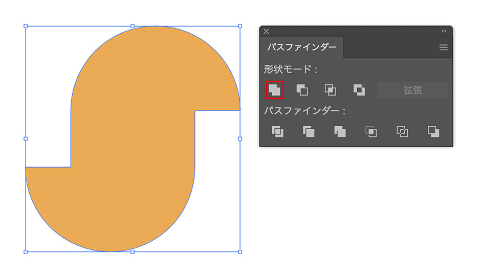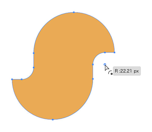 これら3つの図形をすべて選択したら、パスファインダーパネルの[形状モード:合体]をクリックして合体させる(図39)。ダイレクト選択ツールでその内側をクリックすると蛇の目(○の中に●)のマークのライブコーナーウィジェットが表示されるので(図40)、shiftキーを押しながら図形の外側にあるふたつのライブコーナーウィジェットをクリックして選択する(図41)。マークが蛇の目から○に変わるので、いずれかのライブコーナーウィジェットを外側にドラッグすると両方の角が丸くなる(図42)。ここでは、最大限までドラッグして角を大きく丸めたあと(図43)、変形パネルで[回転:35°]に設定して確定したあと、[W:180px]、[H:250px]に設定して適用し(図44)、「S」の字を表現した(図45)。