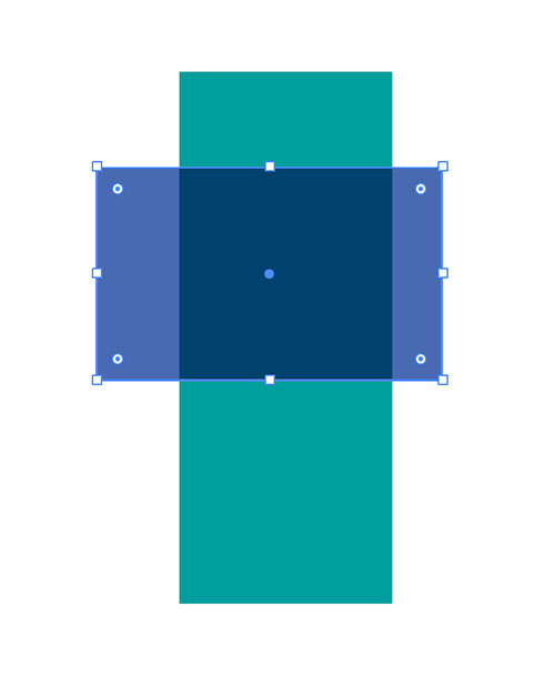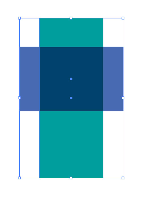 さらに、緑の縦長の長方形と青の横長の長方形を重ねたあと(図26)、両方の長方形を選択して整列パネルの[オブジェクトの整列:水平方向中央に整列]をクリックし(図27)、「t」の字を表現(図28)。