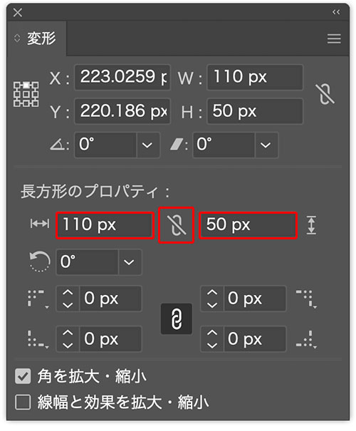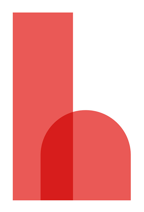 ここまでの手順を応用すると、さまざまな文字を作ることができる。たとえば、赤い縦長の長方形をコピー&ペーストして変形パネルで[W:120px]、[H:120px]に変更したあと(図46)、ダイレクト選択ツールで図形の内側をクリックし、左上と右上のライブコーナーウィジェットを選択して内側に最大限までドラッグして角を丸める。(図47)。これに赤い縦長の長方形をコピー&ペーストして重ねれば「h」の文字になる(図48)。